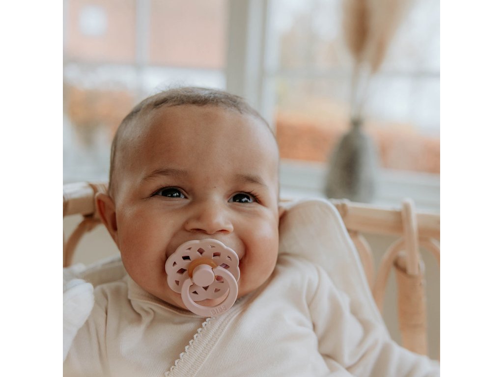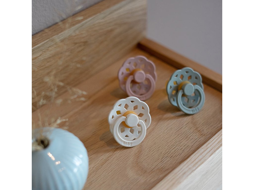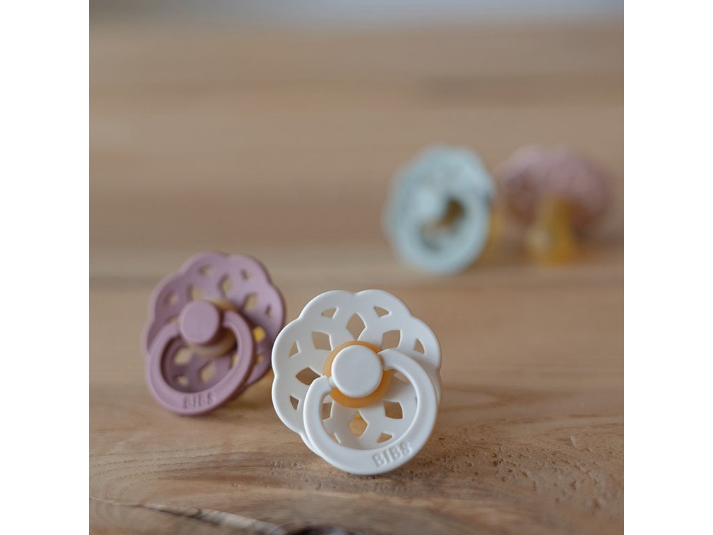 Dva cumlíky BIBS z prírodného kaučuku v štýlovom dizajne. Cumlíky sú extra ľahučké a dieťa saje len 100% prírodný bezpečný materiál.