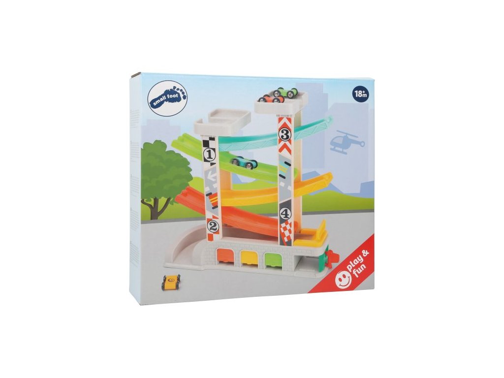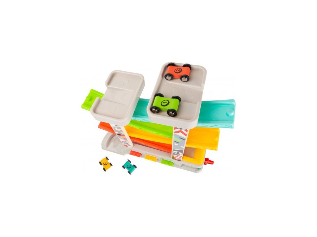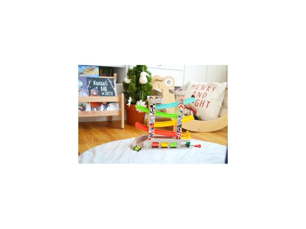 Z parkoviska môžu odštartovať naraz dve pretekárske autíčka po štvorposchodovej klip klap dráhe. Po pretekoch môžu byť autá zaparkované v garážach a pripravovať sa na ďalšiu jazdu! Autodráha pobaví všetkých malých fanúšikov automobilových závodov.