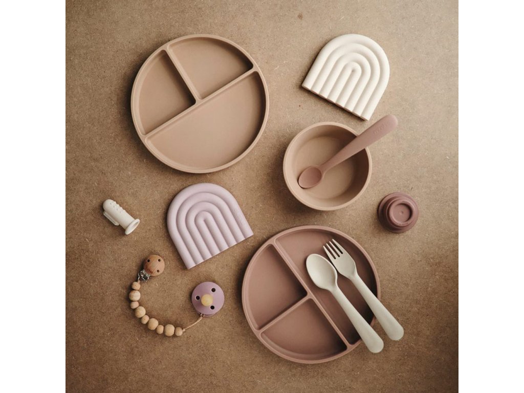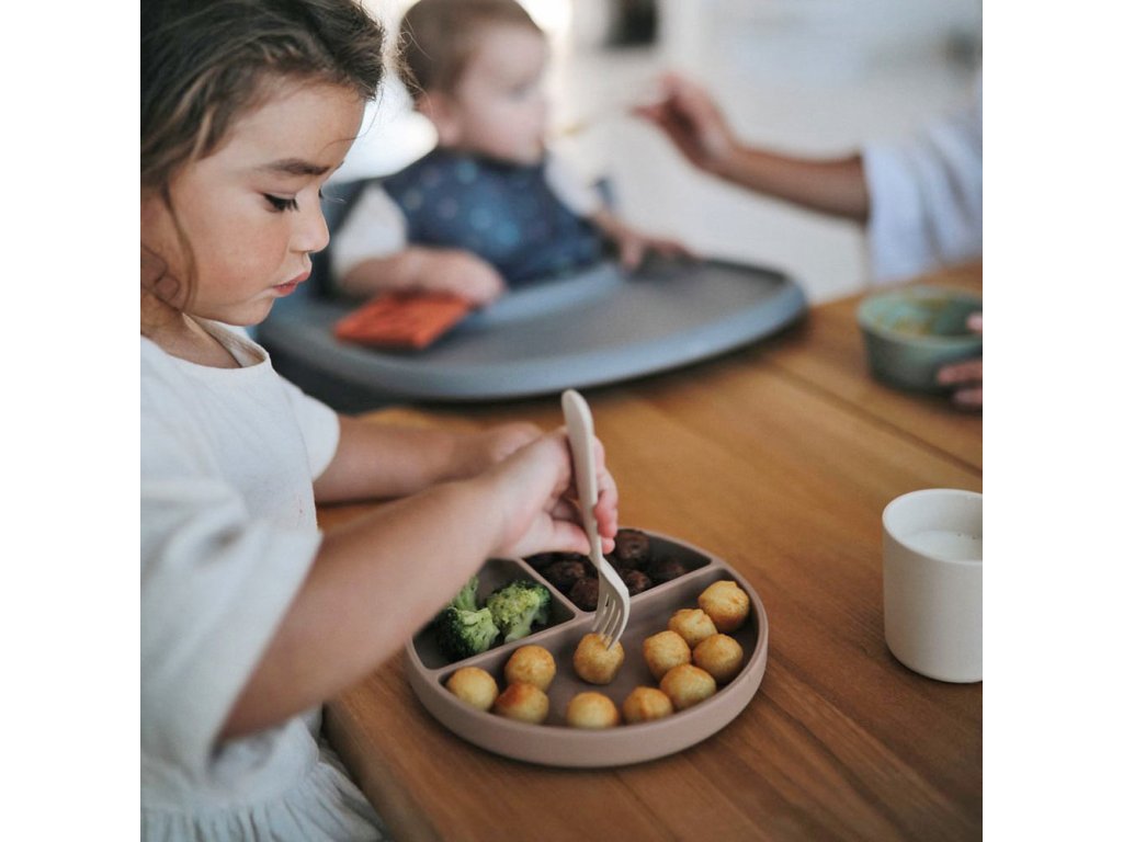 Mushie silikónový protišmykový tanier s prísavkou zostáva stabilný na hladkom povrchu stola, podložky či jedálenskej stoličky.