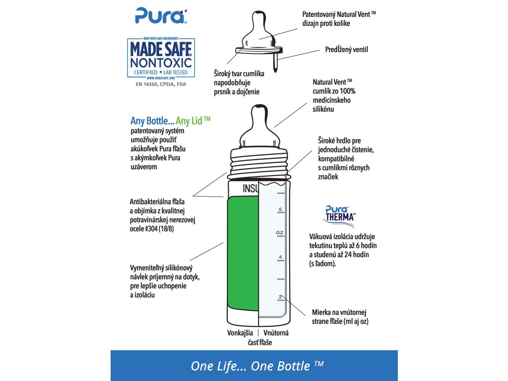 - Baby Grows… Bottle EvolvesTM - patentovaný systém umožňuje použiť akúkoľvek Pura fľašu s akýmkoľvek Pura uzáverom. Jednoducho tak zmeníte dojčenskú fľašu na fľašu s náustkom, slamkou, alebo športovým uzáverom alebo s použitím tesniaceho disku na pohárik na príkrmy a drobné občerstvenie. Jednu fľašu tak môžete používať roky a zároveň šetríte peniaze aj životné prostredie.