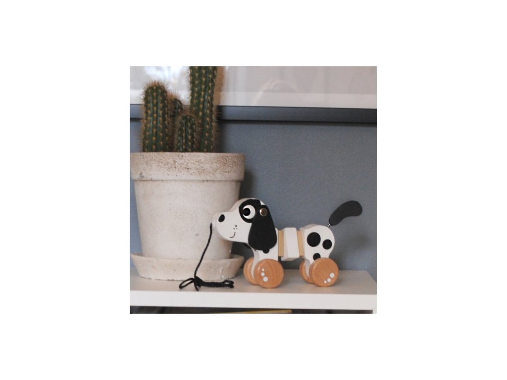 Nádherný drevený čierno-biely psík na šnúrke bude deti motivovať k tomu, aby chodili či behali. Pri pohybe totiž vrtí chvostíkom! Detičky ale môžu hýbať aj jeho uškami alebo kockami uprostred telíčka.